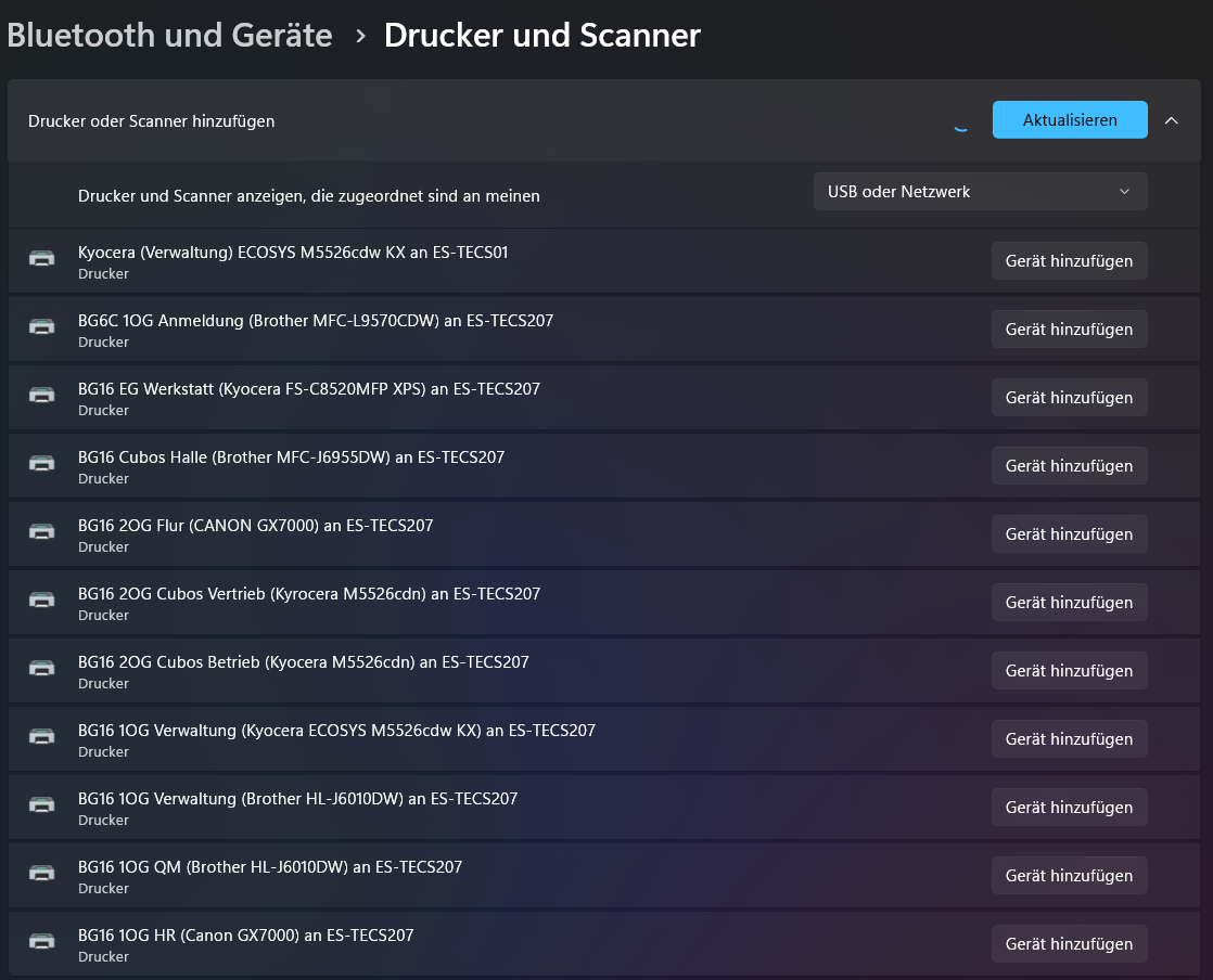 - Es werden nun nach und nach alle verfügbaren Drucker im Netzwerk untereinander angezeigt.
